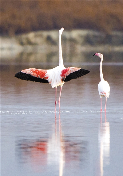 这是12月4日在山西运城盐湖拍摄的火烈鸟。随着气温下降,一些火烈鸟飞抵山西运城盐湖,成为冬日盐湖一道美丽的风景。