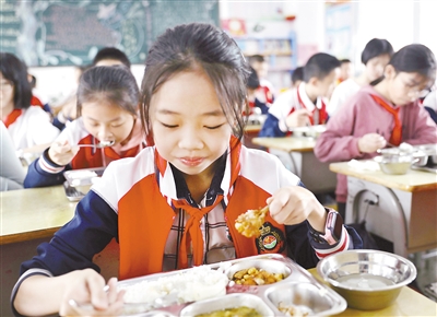 为促进学生健康成长,帮助家长解决按时接送学生困难,永定区城关中心小学实施课后服务和午间配餐。学生午餐多样化、分量足,学校严格监管,确保食品卫生、营养、健康、安全、经济实惠又美味可口。该校每周提前公示菜单,接受家长监督,实行校领导巡查制、陪餐制。图为近日,学生在就餐情景。记者 王耀辉 通讯员 赖守铭 摄