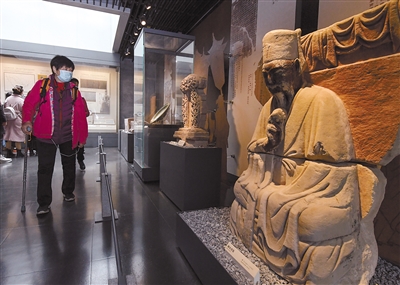 游客在大足石刻博物馆内参观陈列的石刻文物造像(12月10日摄)。近年来,重庆大足石刻研究院不断加强对世界遗产大足石刻的保护利用,形成保护、研究、利用三位一体。研究院先后实施了宝顶山千手观音造像抢救性保护和宝顶山“卧佛”治水工程等文物保护修复项目,并重点加强了对遗址群范围内较为分散的中小石窟的保护工作。