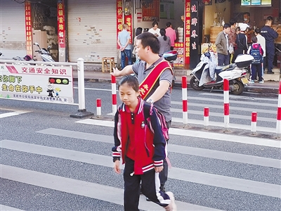 每天早晨,一群志愿者分列在永定实验小学大门外的九一路口,维持上学秩序,一边护送孩子过马路,一边提醒过往车辆有序通过。图为近日志愿者护送学生过斑马线的场面。通讯员 郑素梅 摄