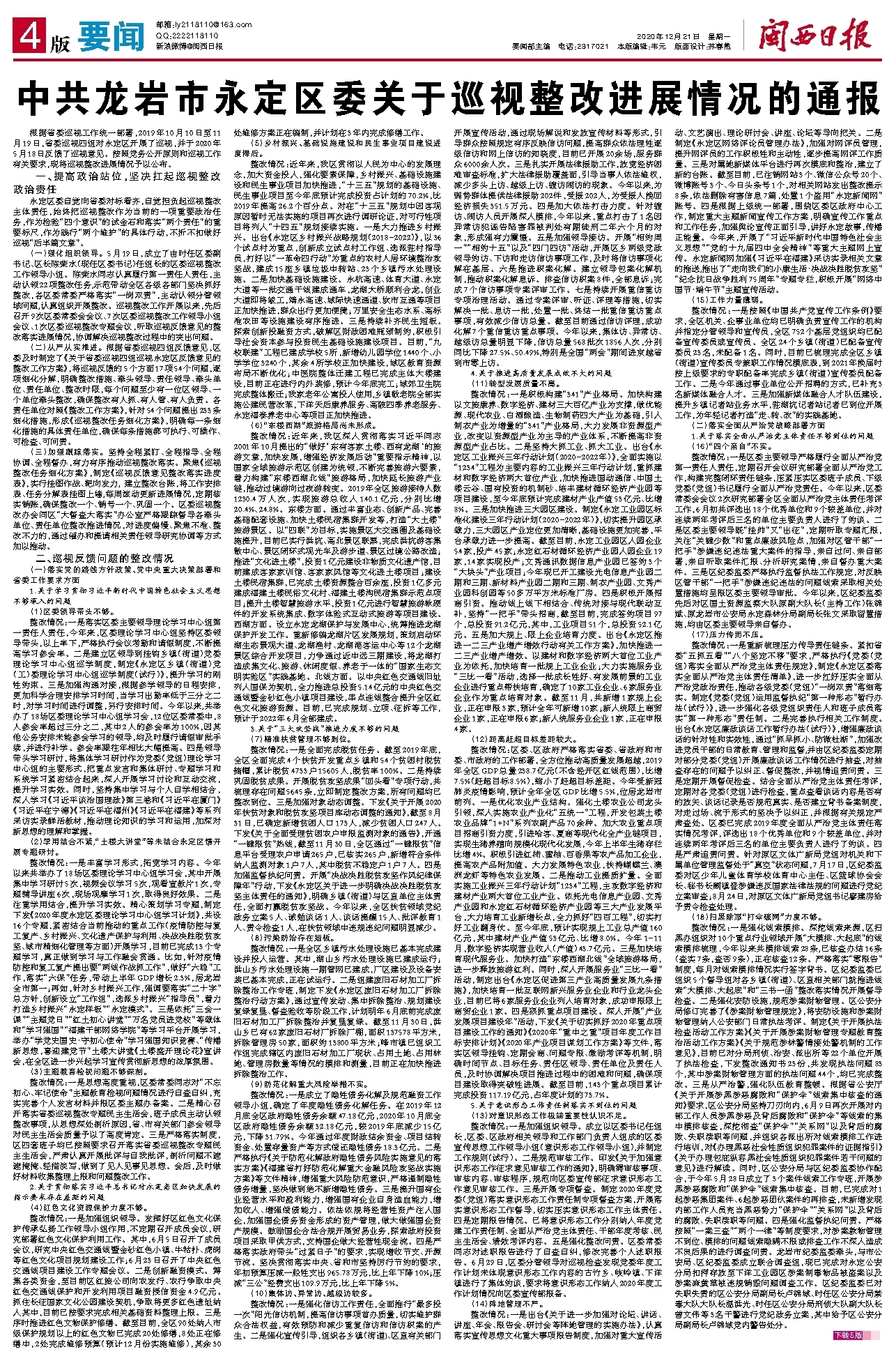 中共龙岩市永定区委关于巡视整改进展情况的通报