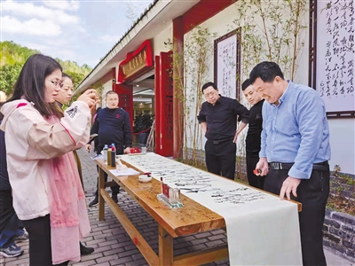 昨日,古田会议会址阳光明媚、游人如织,龙岩毛体书法爱好者为游客义务书写毛泽东诗词书法作品。 记者 王仰华 摄