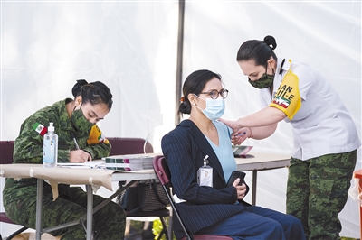 12月24日,在墨西哥首都墨西哥城,一名医护人员(中)接种新冠疫苗。墨西哥24日启动新冠疫苗接种,首批接种者为2900多名参与一线抗疫的医护人员。