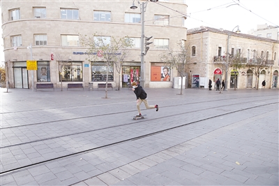 12月28日,一名少年戴着口罩在耶路撒冷空荡的街道上玩滑板。为防控新冠疫情,耶路撒冷从12月27日17时起实施“封城”措施。“封城”期间,民众不可离家超过1000米,室内场所禁止10人以上集会,室外场所禁止20人以上集会,关闭配送服务以外的所有商业和娱乐活动。 新华社 发