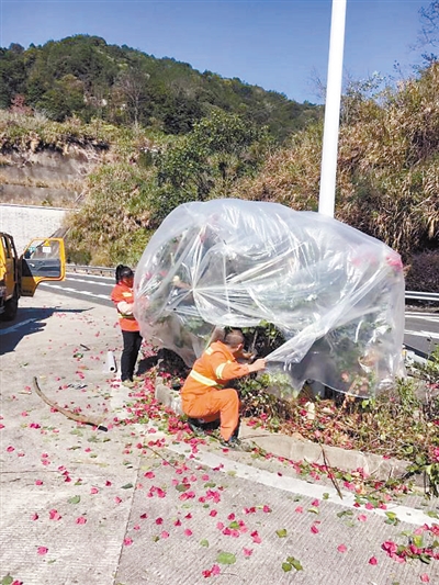 连日来,龙岩高速公路永定片区积极应对寒潮天气,全力确保高速公路人员和财产安全。图为上月30日,永定湖雷养护站工人及时对政永高速公路隧道洞口景观区易冻苗木进行防护处理。