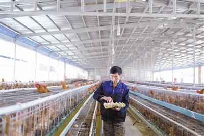 工人在武平县金永诚农牧公司扶贫产业象洞鸡养殖基地捡拾鸡蛋(资料图)。该基地积极吸纳贫困户参与象洞鸡养殖。通讯员 王发祥 摄