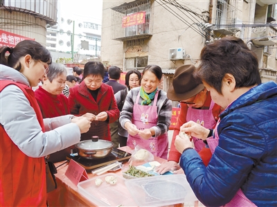 近日,新罗区中城街道北门社区、新罗区政法委在市五交化小区主办“党建引领 近邻幸福”庆元旦系列活动。活动现场,居民参加制作饺子比赛,大家共同品尝饺子,互相祝福;志愿者开展垃圾分类、平安三率、疫情防控、扫黑除恶等宣传活动。图为包饺子比赛的情景。