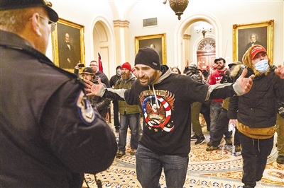 1月6日,示威者在美国华盛顿国会大厦内与警察对峙。美国国会参众两院6日下午召开联席会议,对2020年美国总统选举各州选举人团计票结果进行统计认证。会议开始后不久,部分聚集在国会大厦附近的支持特朗普的示威者冲进国会大厦。美国警方说,部分示威者当天对国会大厦的暴力冲击已造成4人死亡。 新华社 发