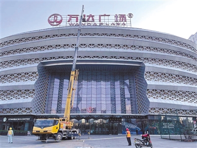 图为拆除万达广场顶楼招牌。