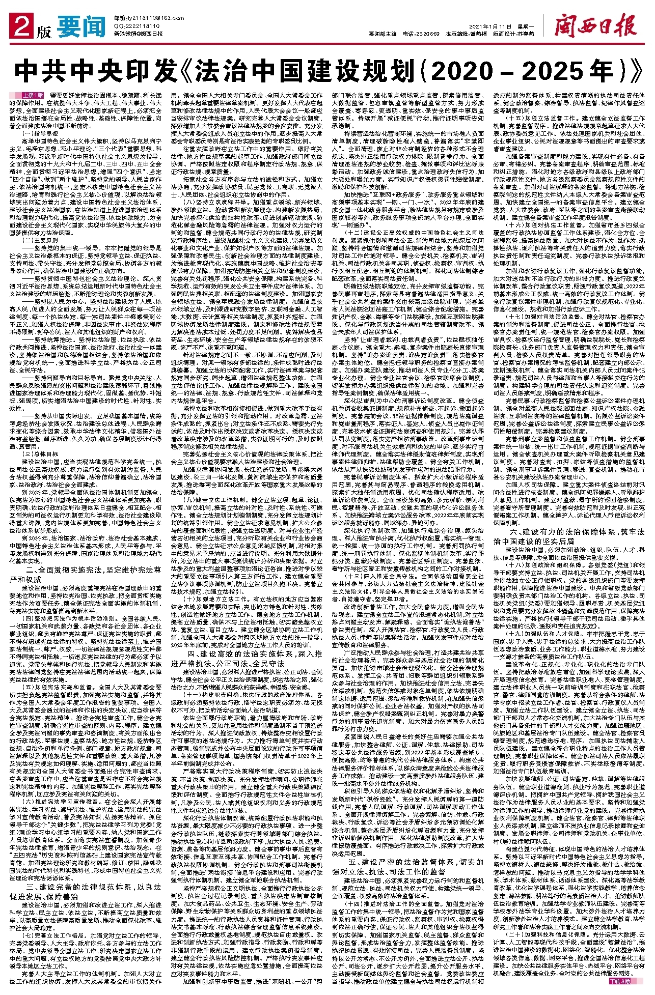 中共中央印发《法治中国建设规划(2020-2025年)》