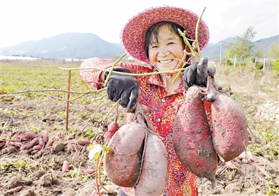 看着刚刚挖出土的这些硕大饱满的地瓜,农户们脸上露出欣喜的笑容。