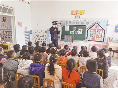 春节将至,为进一步加强校园安全教育和未成年人自我防范意识,近日,新罗西城街道苏溪社区新时代文明实践站志愿者联合西城派出所民警,来到苏溪幼儿园,开展“禁毒、反诈”法制教育进校园宣传活动。图为民警用仿真品向孩子们讲解毒品的类型、危害。