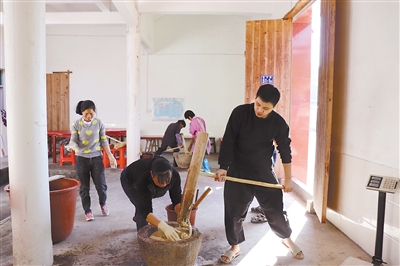 新春佳节临近,长汀县馆前镇马坪村的村民开始制作黄米粿出售。该村是传统黄米粿制作特色村,有数百年的历史。这种黄米粿,用高山某些乔木烧成灰,沥取其汁,浸上等粳米至米色橙黄,冲净蒸熟,置石臼中捣成团,然后分切小块,趁热将其揉压成扁圆或长条形等一整套传统手工艺加工制作,是当地家家户户必备的年货。图为1月29日,村民在打米粿。 通讯员 黎寿钦 摄