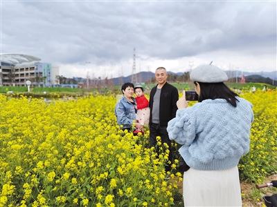 图为14日,市民正在紫金山体育公园油菜花前拍照留念。
