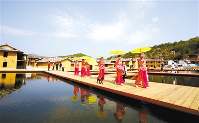 近日,村舞蹈队员在小吉云野涧冰雪项目研学旅行酒店前排练。小吉云野涧冰雪项目位于新罗区白沙镇小吉村,是市重点项目,总投资3.7亿元,占地5平方公里,项目分3期建设,一期将于7月1日对外开放。项目利用其自然优势与冰雪文化巧妙融合,设置六大主题活动,力争打造成福建省首个冰雪旅行营地。 记者 郭亦斌 摄