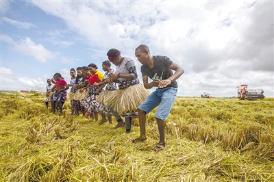 2019年4月7日,在莫桑比克万宝莫桑农业园,农户在水稻收割现场载歌载舞庆祝丰收。万宝莫桑农业园是中国在非洲最大规模水稻种植项目,极大地缓解了莫桑比克粮食短缺问题。 新华社记者 张宇 摄