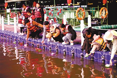 26日,上杭县在做好疫情防控的同时,开展各项传统文化活动,欢度传统佳节。图为上杭市民畅游汀江游艇后放河灯,为家人为祖国祈福。