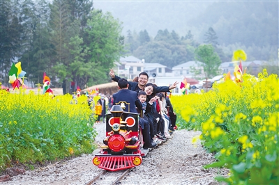 由古田圣地旅投公司打造的古田步云千亩花海项目于2020年10月份启动,选址在古田景区景观带和五龙村,项目总投资400万元。设有天空之镜、七彩滑道、花田小火车、射箭靶场、亲子卡丁车等项目,再现“圣地党旗红、十里菜花香”的诗画胜景。图为“欢乐谷小火车”吸引大批游客前来游玩。