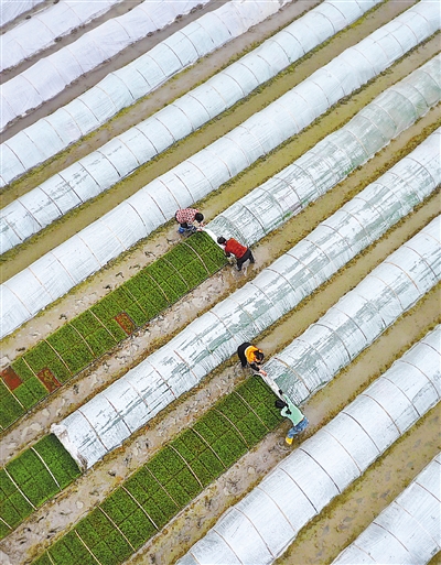 永定区湖雷镇上北村利民家庭农场通过农户合作形式,流转土地150亩,种植早稻、再生稻、芋后稻等,该农场利用水稻工厂完善的设备进行生产,年产值达40万元以上,走上致富路。图为昨日,农场农民在稻秧圃里掀膜,让秧苗进行光合作用,促进稻苗茁壮成长。