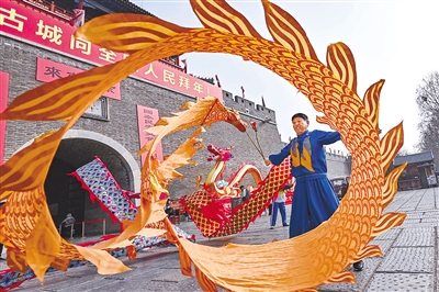 3月14日,民间艺人在山东省青州古城景区表演健身龙。