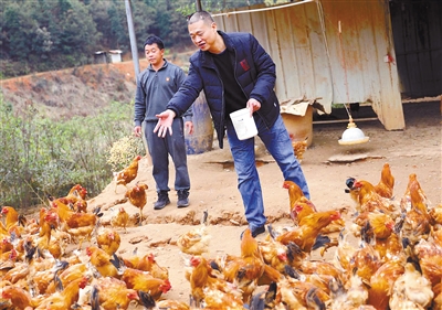 省公安厅交警总队派驻上杭县南阳镇涂坑村驻村第一书记程依涛,在涂坑村实施激励性扶贫项目,选择村干部钟文灿的文灿家庭农场河田鸡养殖项目作为激励性扶贫平台,由镇政府统筹财政扶贫资金,免费为贫困户每户发放100-200羽河田鸡苗进行分散饲养,采取“竞争上岗”和“效益优先”方式,实施激励性扶贫,让贫困户通过竞争方式更多地获得项目、实物和资金上的倾斜和帮扶,三年来带动村里50名贫困户户均增收万元以上,并引领涂坑村全面脱贫。图为日前程依涛在家庭农场检查河田鸡养殖情况。
