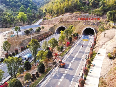 新罗区实施小池高速出口周边环境整治项目,在小池—古田快速通道沿线约4.98公里实施绿化园林工程,总投资约2800万元。目前沿线路段包括小池出口、黄斜村路口、成功隧道口三个重点位置绿化施工均已进入最后冲刺阶段,本月20日部分节点将完工,将为古田圣地南大门增姿添彩。图为近日该项目成功隧道口绿化施工作业场面。 记者 傅长盛 摄