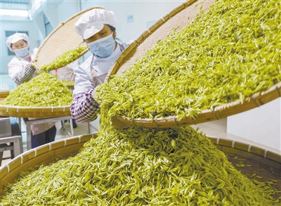 3月23日,在景宁畲族自治县一茶叶加工企业,工人在杀青车间忙碌。眼下,位于浙南山区的丽水市景宁畲族自治县进入春茶采摘加工忙碌时节。景宁是国家地理标志产品惠明茶的产地。近年来,该县通过龙头企业带动,制茶非遗传承人引领,不断优化制茶工艺,提升茶叶品质,带动茶农增收致富。 新华社 发