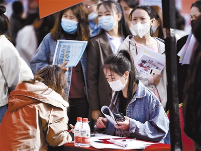 3月24日,学生在春季校园招聘会上与招聘单位代表交流。当日,青海省2021届高校毕业生春季校园招聘会在青海交通职业技术学院体育场举行,共有230余家单位提供岗位8500余个,吸引众多应届毕业生前来应聘。