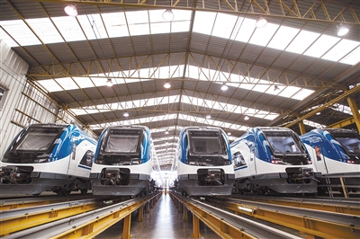 这是3月23日在智利首都圣地亚哥拍摄的轨道列车。智利交通和电信部长乌特23日参观停靠在首都圣地亚哥的15列中国轨道列车,称赞这批车辆的到来是近年来智利“铁路发展最重要的里程碑之一”。 2018年到2019年,中国中车青岛四方机车车辆股份有限公司(中车四方)与智利特莫伊萨公司组成的联合体在国际竞标中胜出,与智利国家铁路公司签署合同,为智利南方三条铁路线提供内燃动车组和电动车组。 新华社 发