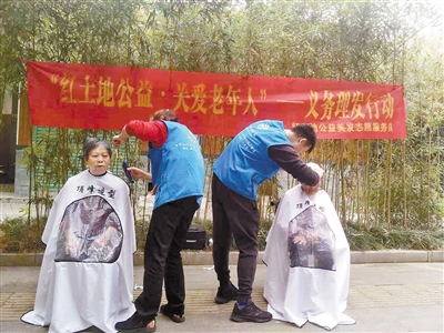 日前,永定一支美发队的成员来到凤城街道春霭园,在河滨公园为群众免费理发。美发队成员来自顶峰造型美发店,成员有张寿峰等人。当日共为20名群众理发。据悉,该项公益活动从2017年开始,已经坚持了5年,服务时间固定在每个星期一,理发地点固定在春霭园。5年来,志愿者服务群众大约4000人次。图为免费理发场面。 通讯员 郑素梅 张寿峰 摄