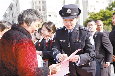 为营造良好法治宣传氛围,提升广大群众防范电信网络诈骗意识,连日来,上杭县公安局会同县检察院、法院及司法局等多部门走上街头深入开展法治宣传活动,受到群众好评。截至3月22日,共开展宣传活动3场,5000多市民受到教育。图为女民警向群众讲解如何防范电信网络诈骗时的情景。