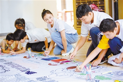 龙岩文明大使何雯娜与中小学生一同绘制垃圾分类宣传海报。