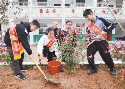 日前, 连城县塘前学校开展“植树爱绿,我为校园添新彩”主题教育活动。几名9年级学生环保志愿者,在老师指导下,挥锹挖土,在校园绿化带栽种红叶石楠。据悉,当日,塘前学校在绿化带栽种下400棵红叶石楠。通讯员 邹善水 摄