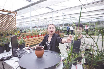 近日,连城兰花博览园的兰花直播带货日益火热,线上订单不断。近年来,连城兰花博览园,采取线上线下双模式统一销售“连城兰花”产品,成立了电子商务中心,并被评为“全国首批互联网+花木产品营销模式示范单位”,帮扶带动建档立卡贫困户359户1101人,人均增收3000-5000元,助力连城实施乡村振兴战略。图为主播正在直播中介绍兰花品种。 记者 蓝明丰 摄