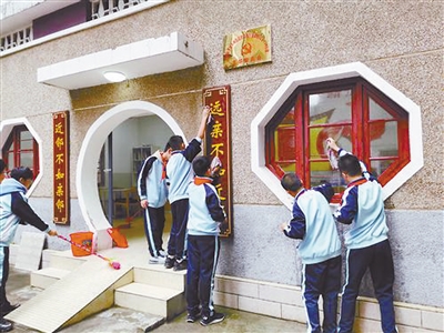 日前,新罗区东城松涛社区携手辖区青少年志愿者们开展“学雷锋进巷道,党旗队旗迎风飘”志愿服务。图为松涛小学的学生在小区活动室大扫除的情景。记 者 罗姝