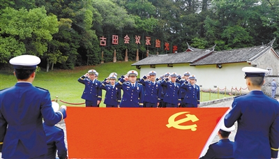 4月16日,龙岩市森林消防支队党委机关将党史学习教育课堂搬到革命圣地——古田会议会址和长征出发地长汀县南山镇中复村,带领机关和直属队全体党员寻根溯源,开展现场教学,缅怀革命先辈,重温峥嵘岁月,这堂课大家直呼“解渴”。图为党员们在古田会议会址前重温入党誓词。 记者 郭亦斌 通讯员 童鹏程 摄