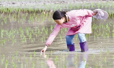 梁永英在检查秧苗生长情况并对倒伏的秧苗加以扶正。