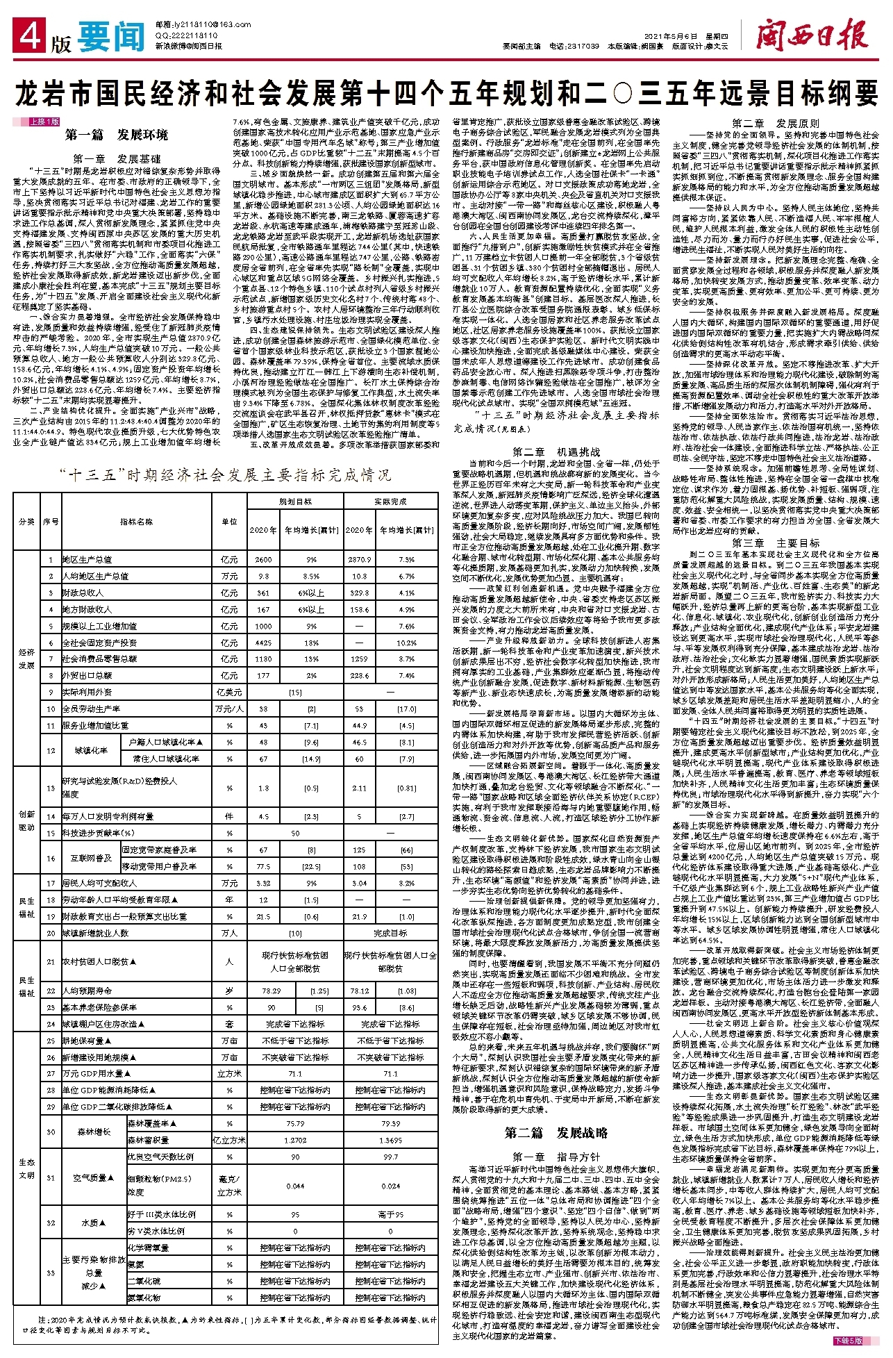 龙岩市国民经济和社会发展第十四个五年规划和二○三五年远景目标纲要