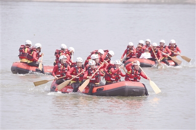 5月10日,红十字救援队进行水上救生演练。当日,由中国红十字会总会主办的“同心协力-2021”中国红十字会应急救援综合演练在福州举行,来自全国的13支红十字救援队和东海第二救助飞行队系统演练了水上救生、搜救、医疗、供水等以“水上救援、抗洪救灾”为主题的实战救援课目,以进一步提升各级各类红十字救援队联合救援能力。 新华社记者 姜克红 摄
