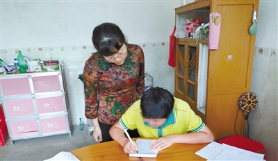 图为近日,朱老师在湘店镇为特殊学生送教上门。