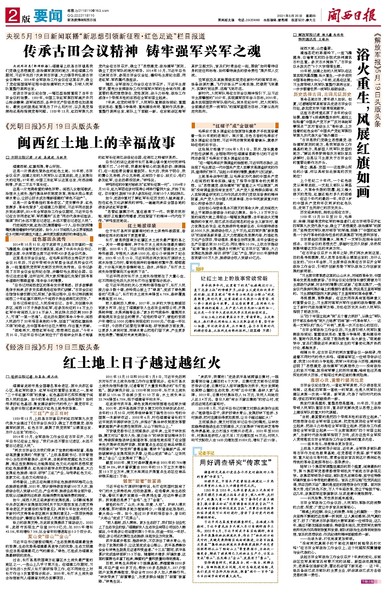 革命战争年代,这里留下的是“红旗越过汀江,直下龙岩上杭”的峥嵘岁月;社会主义建设和改革开放时期,这里呈现出“绿水青山就是金山银山”的发展新景;新时代里,这里涌现出无数齐心战贫困、同心奔小康的奋斗故事。在这些故事里,在闽西儿女通往幸福的道路上,共产党人的为民初心始终如一,这正是一个百年大党依然风华正茂的秘密所在。