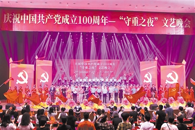 为深入学习贯彻习近平新时代中国特色社会主义思想和党的十九届五中全会精神,弘扬社会主义核心价值观和诚实守信的传统美德,由市委宣传部、市委文明办、市市场监管局、市文学艺术界联合会联合主办,市守合同重信用企业协会承办的庆祝中国共产党成立100周年——“守重之夜”文艺晚会,5月21日晚在龙岩人民会堂盛大演出。由20多家守重企业选送的14个精彩节目,引来全场观众阵阵掌声。图为全体演职人员和全场观众大合唱《没有共产党就没有新中国》。 记者 郑秋生 摄