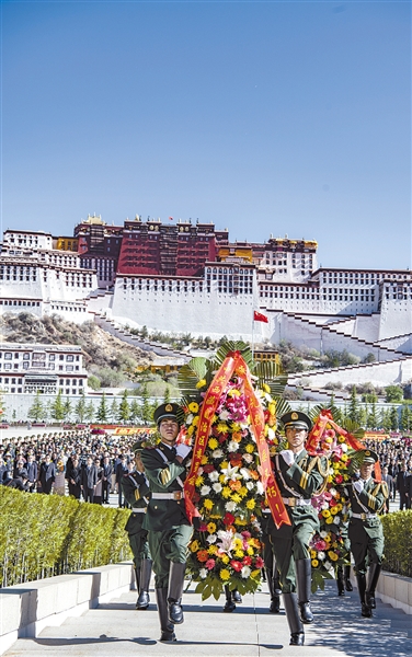 5月23日,西藏各族各界群众一千余人在西藏和平解放纪念碑前,向革命先烈敬献花篮、鲜花,深切缅怀为西藏和平解放事业英勇牺牲的革命先烈。今年是西藏和平解放70周年。1951年5月23日,《中央人民政府和西藏地方政府关于和平解放西藏办法的协议》签订,宣告西藏和平解放。 新华社记者 普布扎西 摄
