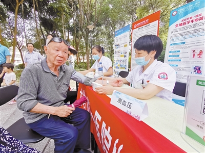 近日,新罗区西城街道西桥社区党委联合龙岩市第一医院生殖医学科党支部,开展“学党史、办实事、义诊送健康”暖心主题党日活动,将党史学习教育与为群众办实事、解难题结合起来。图为活动现场,党员志愿者为社区居民测血压、检查身体。 记者 罗姝 通讯员 章义萍 摄