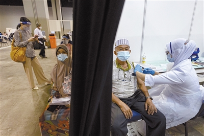 5月31日,人们在马来西亚吉隆坡的疫苗接种点接种新冠疫苗。鉴于新冠疫情形势严峻,马来西亚从6月1日开始在全国范围内实施“全面封锁”,暂停经济和社会活动。 新华社发(张纹综摄)