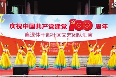 日前,由市委离退休干部工委主办的“百年风华——庆祝中国共产党建党100周年”离退休干部社区文艺团队汇演在中心城区西安社区举行。现场,来自中心城区8个社区的离退休干部、老年朋友们,以舞蹈、合唱、京剧、乐器合奏等多种表演形式讴歌建党百年波澜壮阔的奋斗历程,引领社区文化养老新风尚。记者 曾燕福 通讯员 黄旭 文涌 荣凌 摄