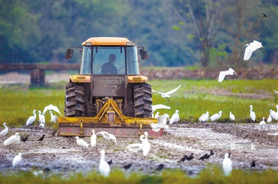 一台拖拉机在河田南塘的田间翻耕作业,引来了成群的白鹭到此觅食,呈现出一幅人与自然和谐相处的温馨画面。