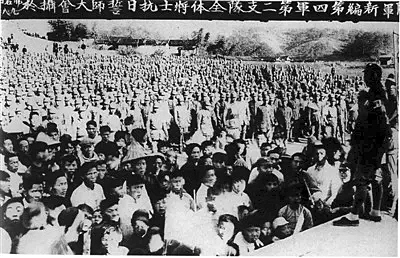 1938年2月27日,新四军第二支队全体指战员在东肖召开北上抗日誓师大会时的留影。