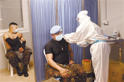 6月28日,在黎巴嫩南部迈尔季欧云地区伊贝尔·萨吉村中国维和医疗队营区,中国维和医疗队队员为联黎部队官兵注射新冠疫苗。中国第19批赴黎巴嫩维和医疗分队28日在黎南部迈尔季欧云地区伊贝尔·萨吉村营区为联合国驻黎巴嫩临时部队(联黎部队)官兵接种第二剂新冠疫苗。中国赴黎维和医疗分队已于5月18日完成联黎部队官兵首剂疫苗接种工作,共接种2086人。