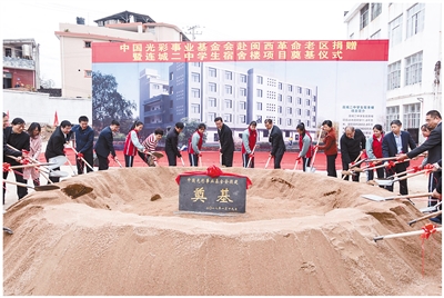 2018年1月19日,中国光彩事业基金会理事长李路一行到龙岩举行中国光彩事业基金会赴闽西革命老区捐赠暨连城二中宿舍楼项目奠基仪式。此次活动共筹集资金1080万元,用于闽西老区脱贫攻坚项目。